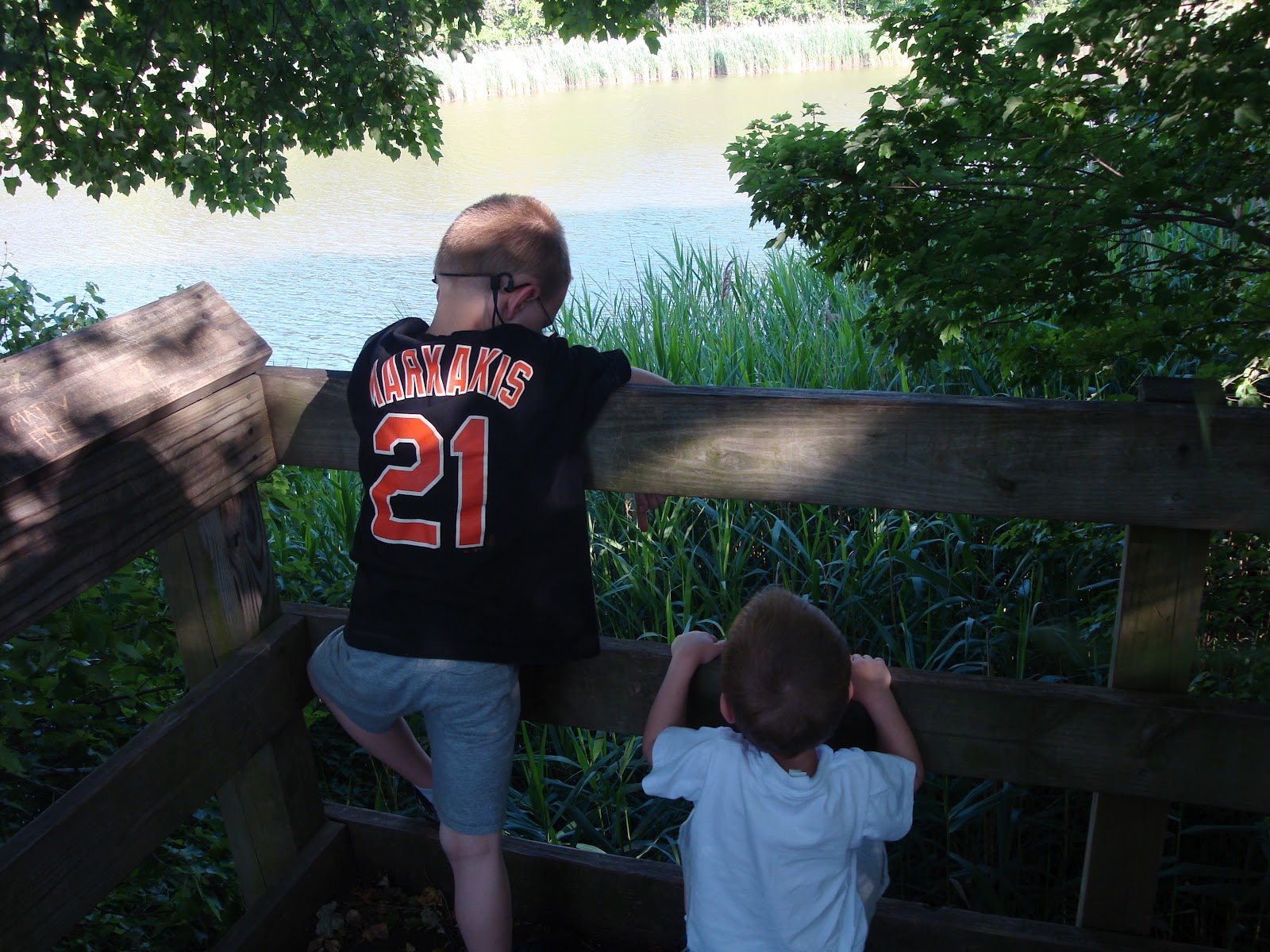 There are piers that go out to the water. On this trip the boys were looking for a frog that they could hear.